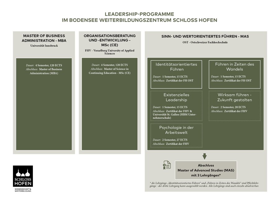 Mit dem modularen Masterprogramm „Sinn- und Wertorienteniertes Führen, MAS“ mit Abschluss MAS nach Schweizer Recht sowie den zwei eigenständigen außerordentlichen Masterstudien „Master of Business Administration – MBA“ der Universität Innsbruck und „Organisationsberatung und -entwicklung – MSc (CE)“ der FHV bietet Schloss Hofen ein breites akademisches Programm - vom kompakten Hochschulkurs bis über ein Masterstudium – je nach Zielsetzung des Kompetenzerwerbs sowie zeitlicher Verfügbarkeit.