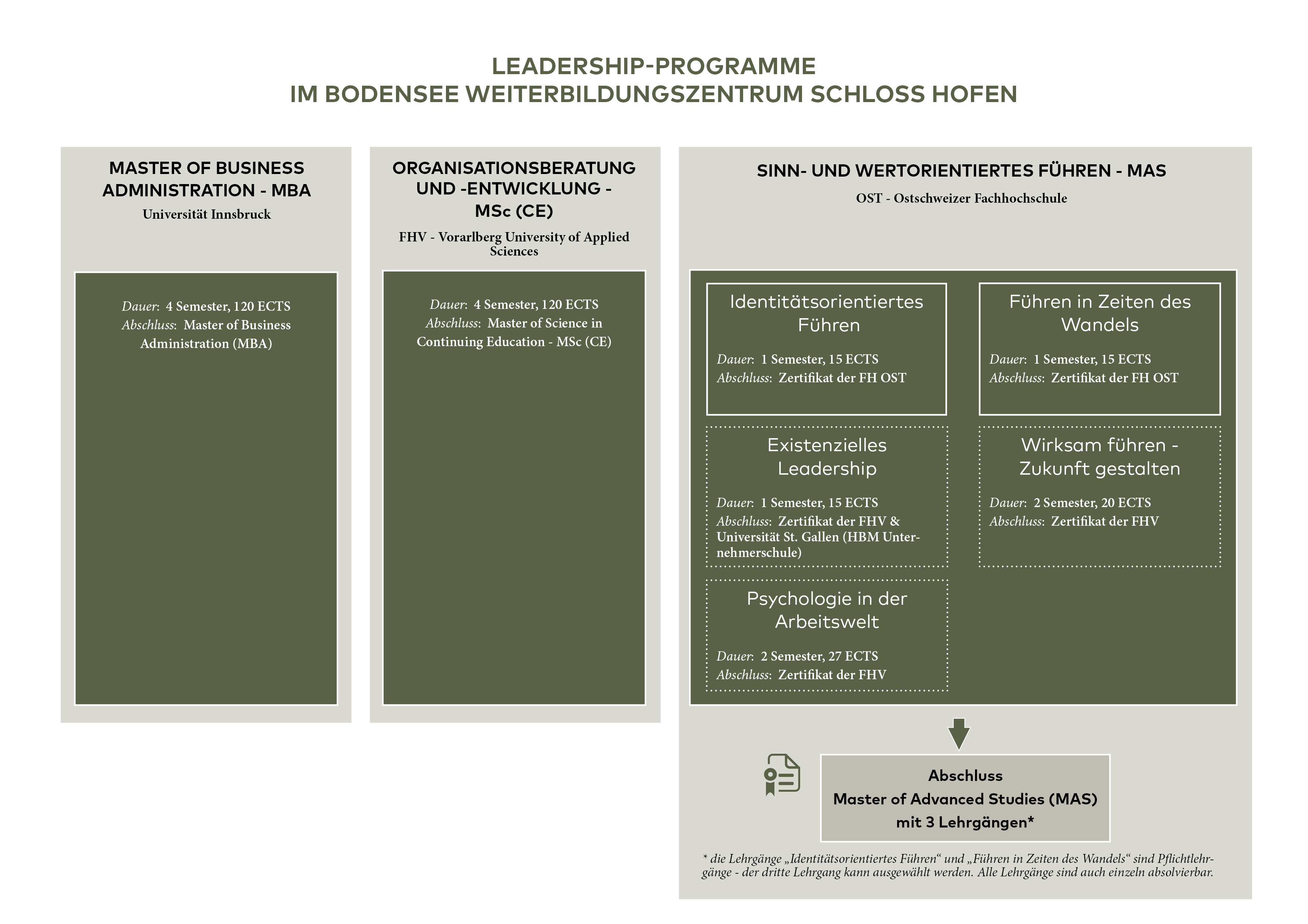 Mit dem modularen Masterprogramm „Sinn- und Wertorientiertes Führen, MAS“ mit Abschluss MAS der Ostschweizer Fachhochschule OST sowie den zwei eigenständigen außerordentlichen Masterstudien „Master of Business Administration – MBA“ der Universität Innsbruck und „Organisationsberatung und -entwicklung – MSc (CE)“ der FHV bietet Schloss Hofen ein breites akademisches Programm - vom kompakten Hochschulkurs bis über ein Masterstudium – je nach Zielsetzung des Kompetenzerwerbs sowie zeitlicher Verfügbarkeit.